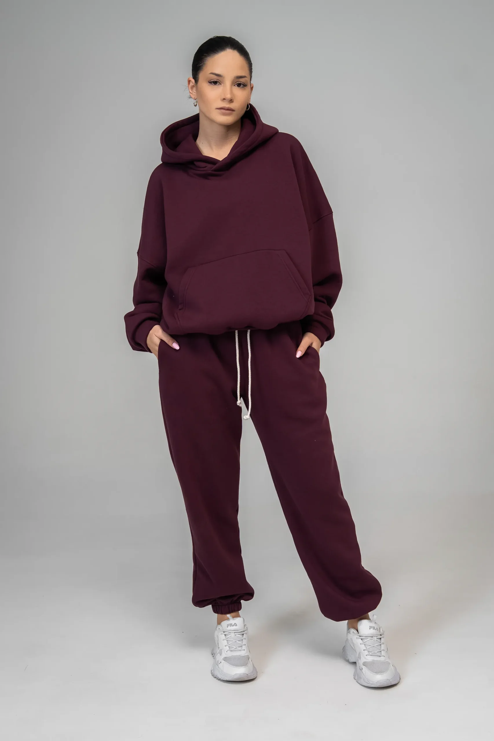 Oversize’owa bluza wkładana przez głowę oraz spodnie z elastycznym pasem i ściągaczami przy nogawkach tworzą wygodny, sportowy zestaw. Komplet dresowy damski w kolorze burgundu zapewnia swobodę ruchów i wpisuje się w nowoczesny, casualowy styl.