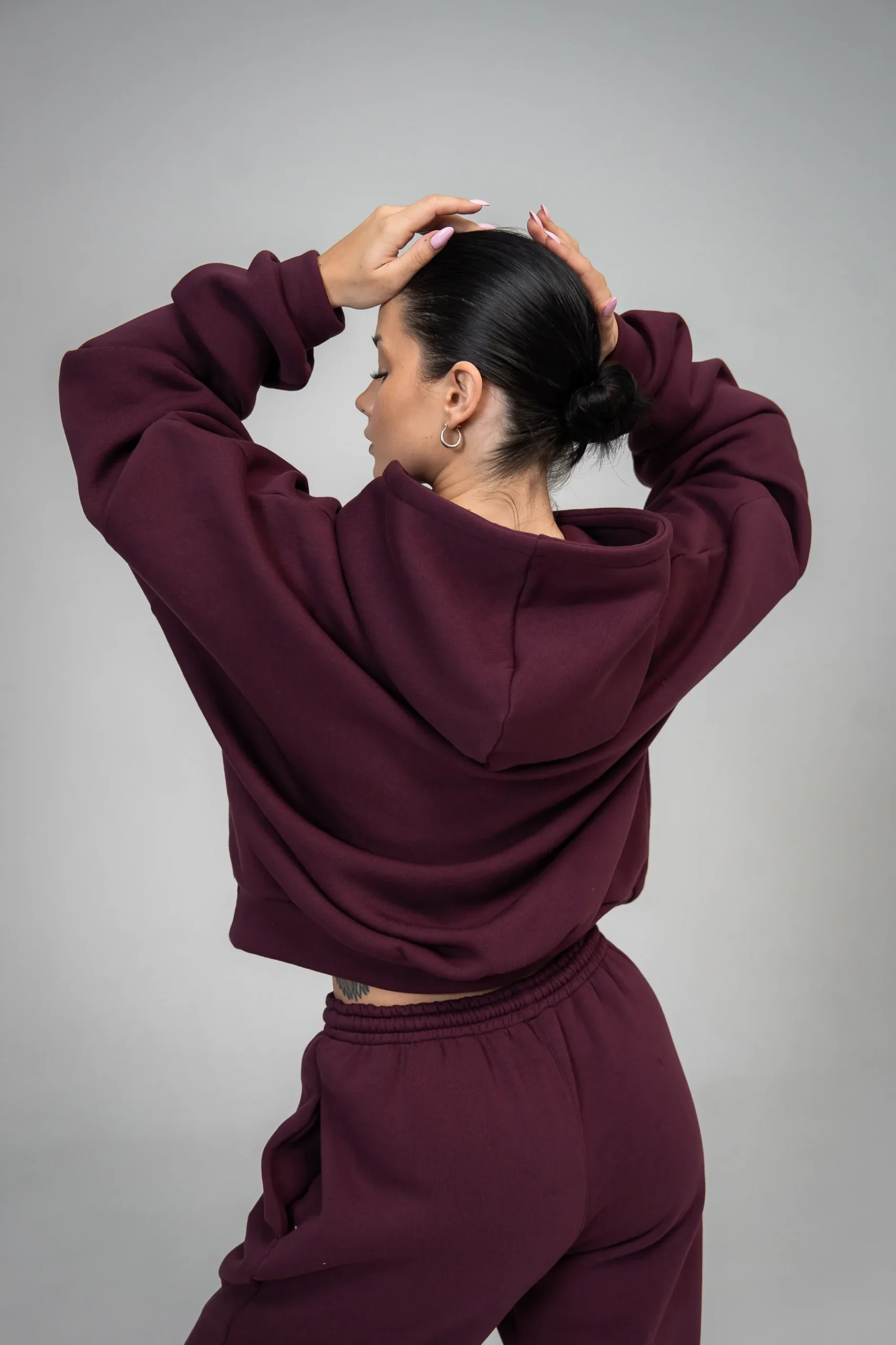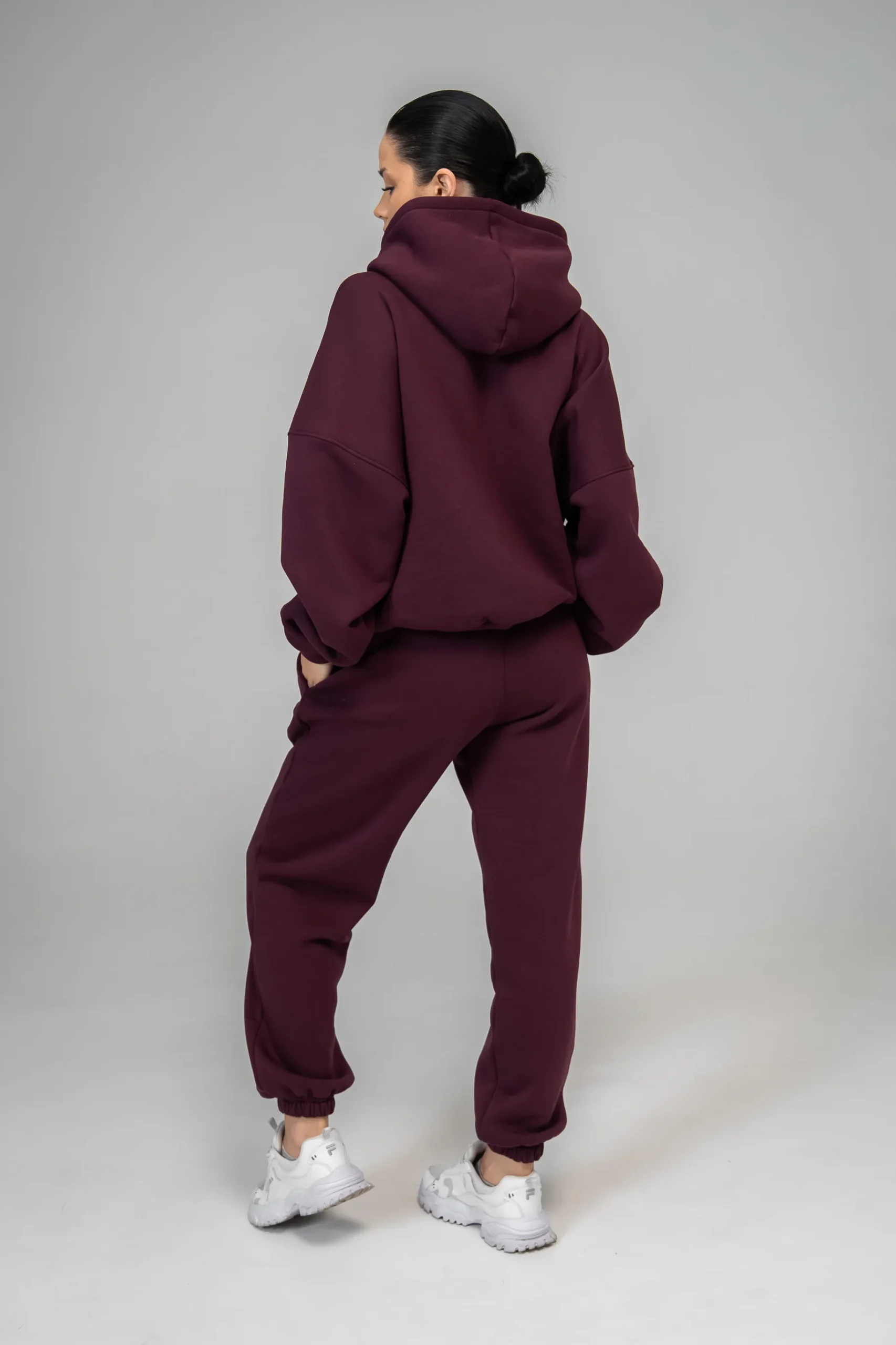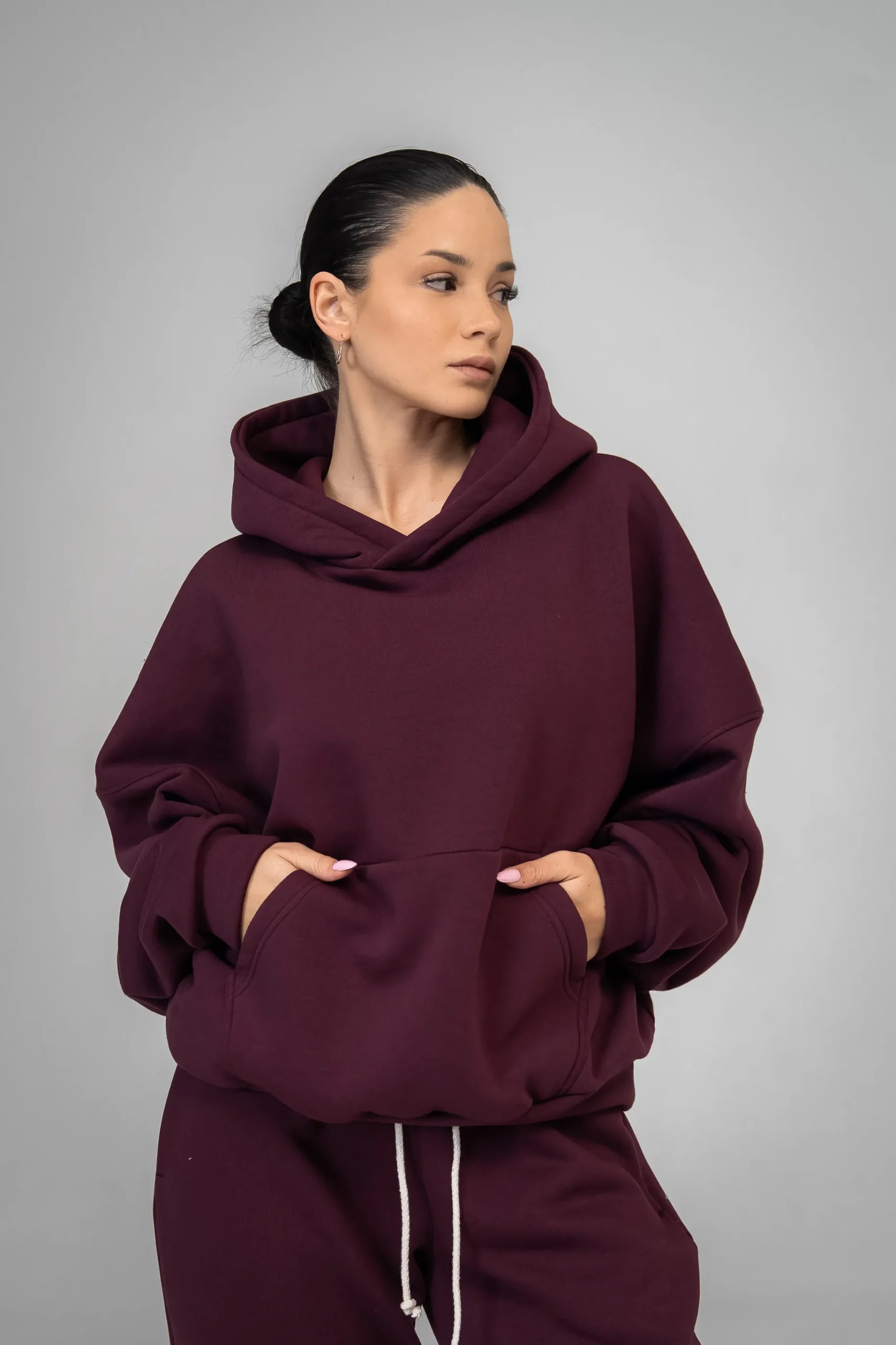 Głęboka czerwień pięknie komponuje się z neutralnymi dodatkami i nie wymaga wielu akcentów, aby wyglądać efektownie. Bawełniany komplet dresowy burgund sprawdzi się na spacer, podróż, home office czy w stylizacjach typu athleisure.