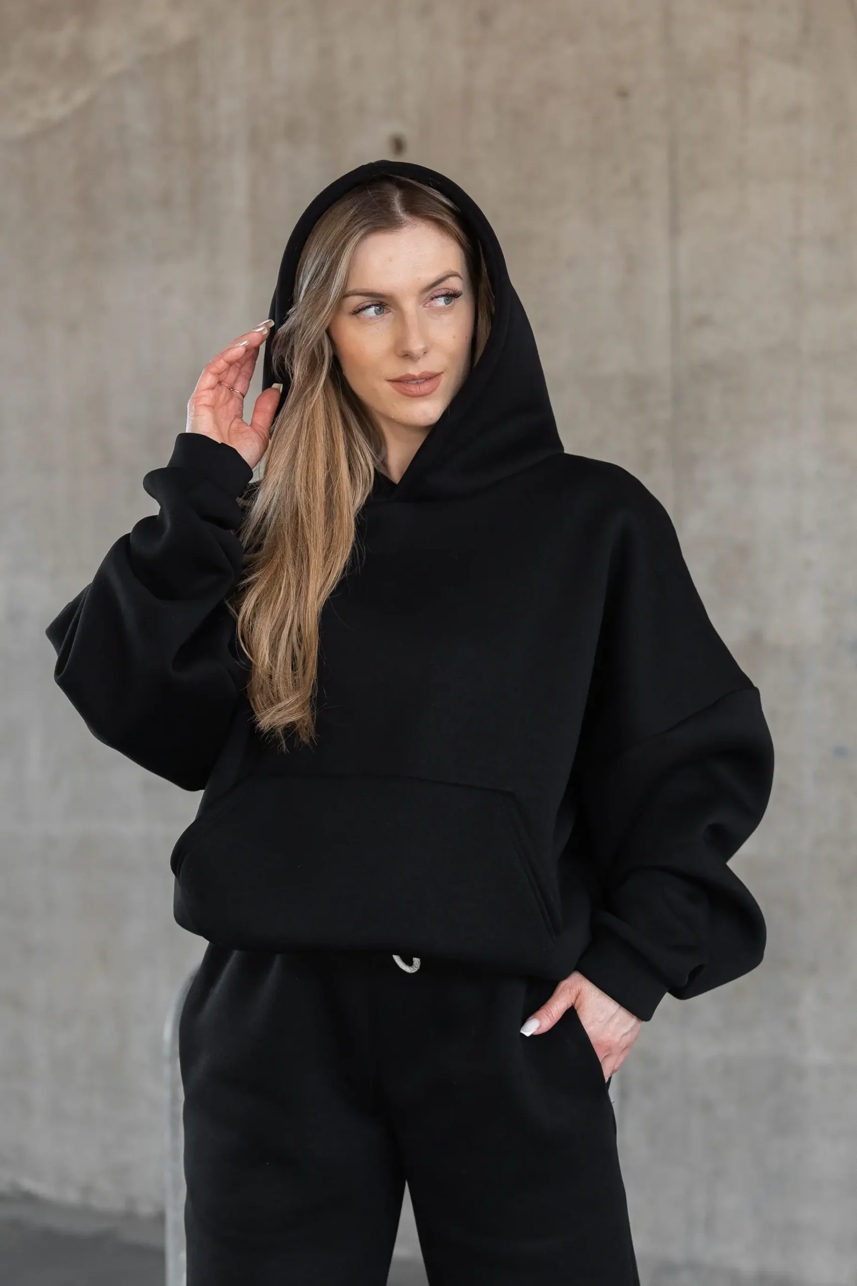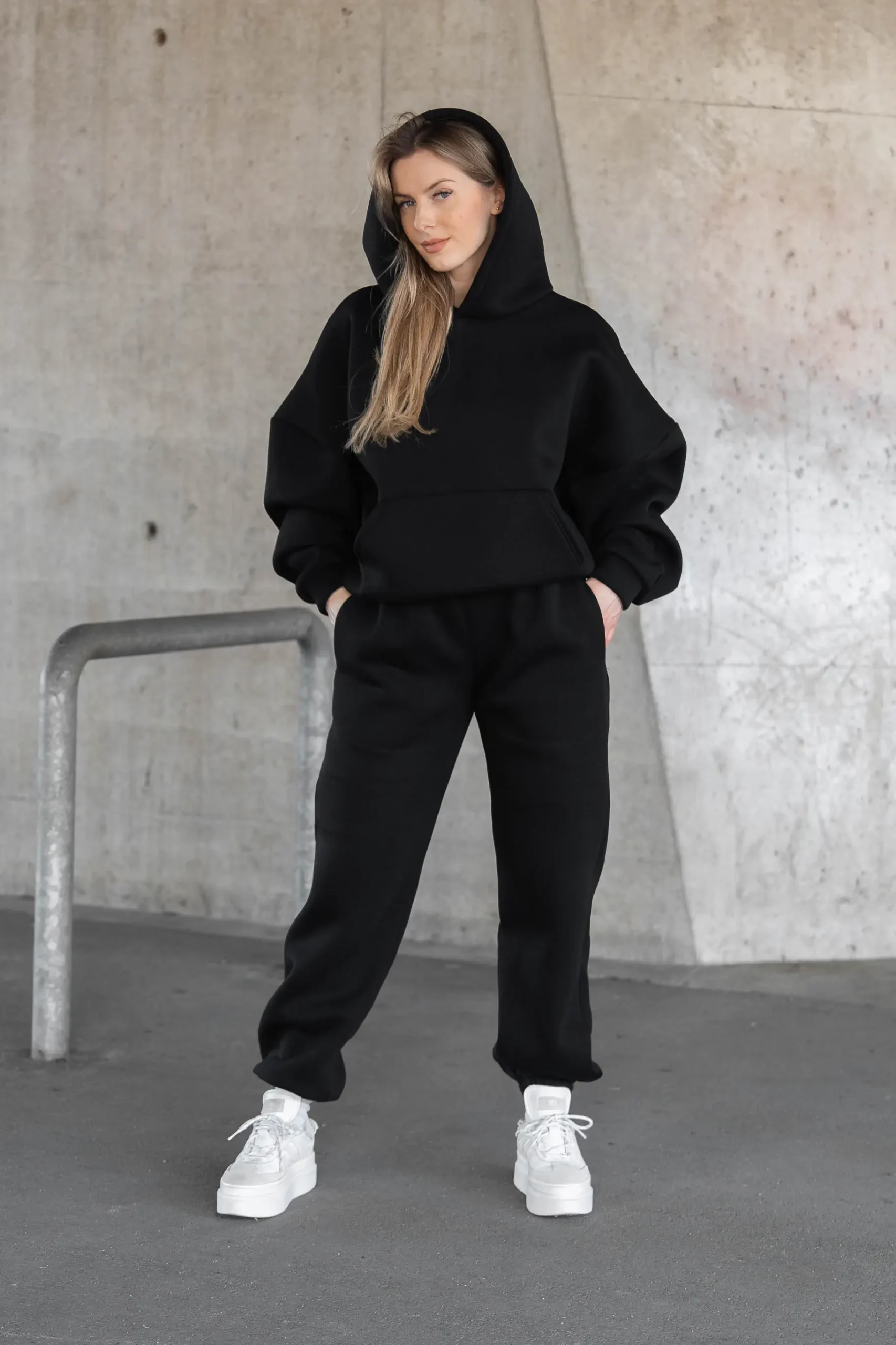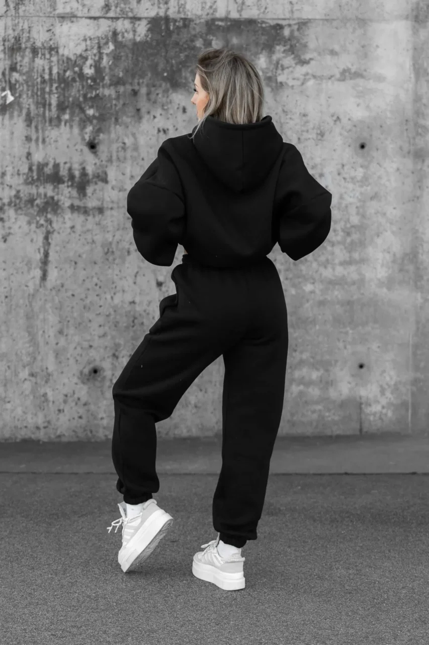 Czarna bluza oversize świetnie sprawdzi się zarówno jako element kompletu dresowego, jak i noszona osobno – do legginsów, jeansów czy spodni materiałowych. To model, który wpisuje się w styl athleisure i casual, idealny do codziennych stylizacji.