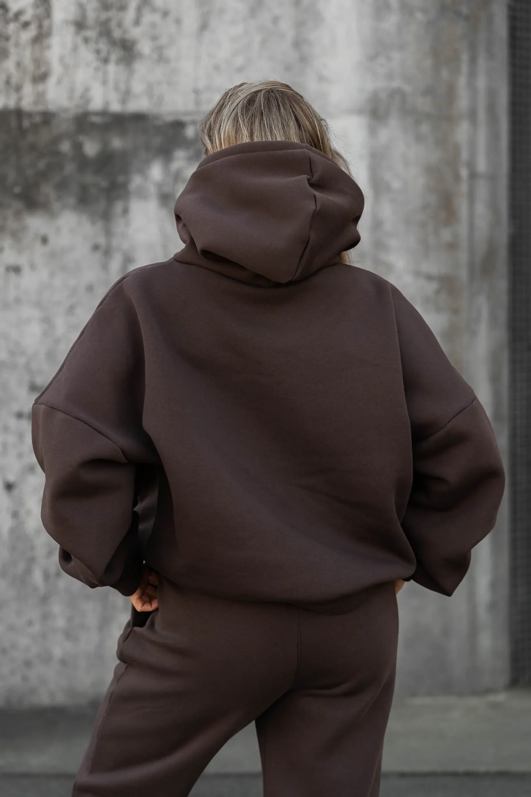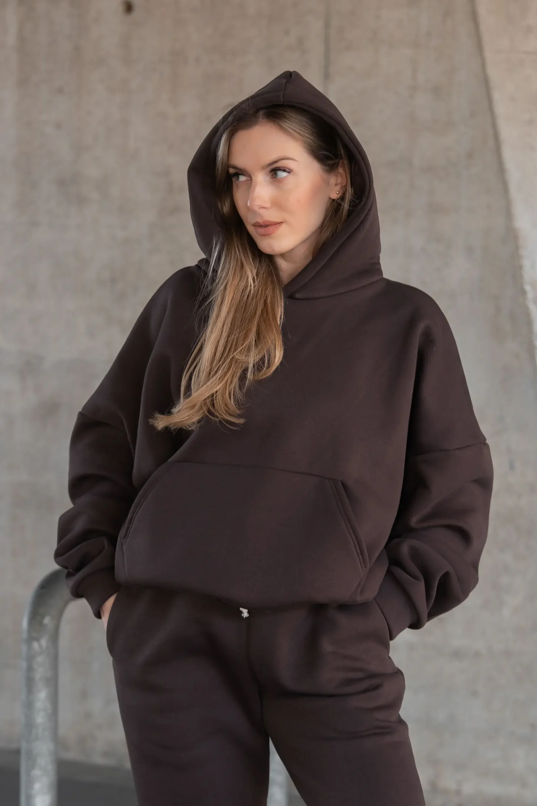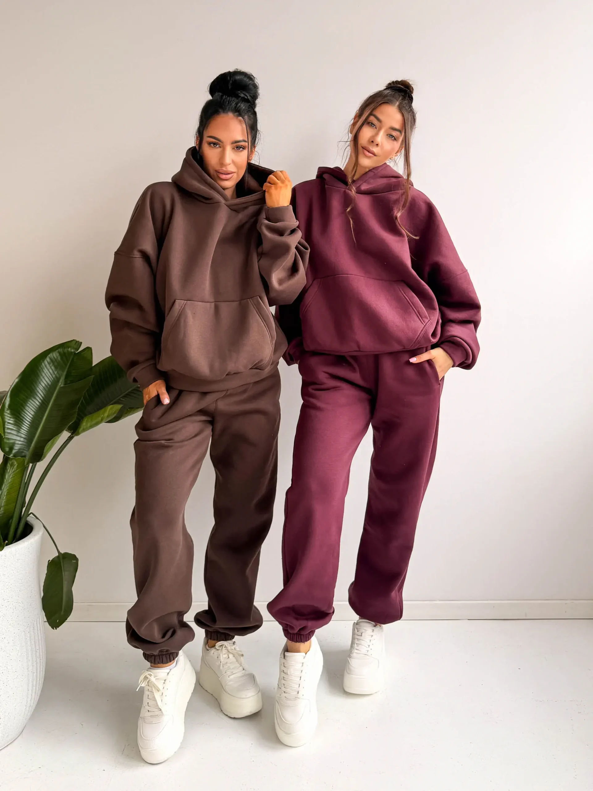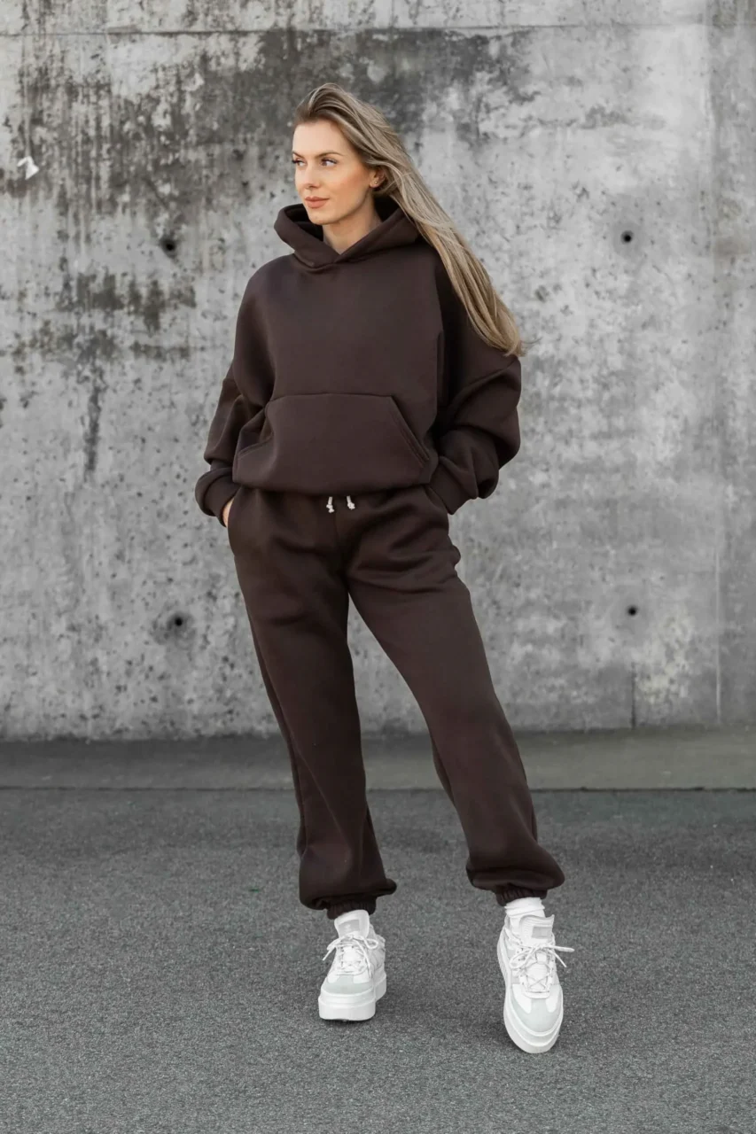 Burgundowa bluza oversize świetnie sprawdzi się zarówno jako element kompletu dresowego, jak i noszona osobno – do legginsów, jeansów czy spodni materiałowych. To model, który wpisuje się w styl athleisure i casual, idealny do codziennych stylizacji.