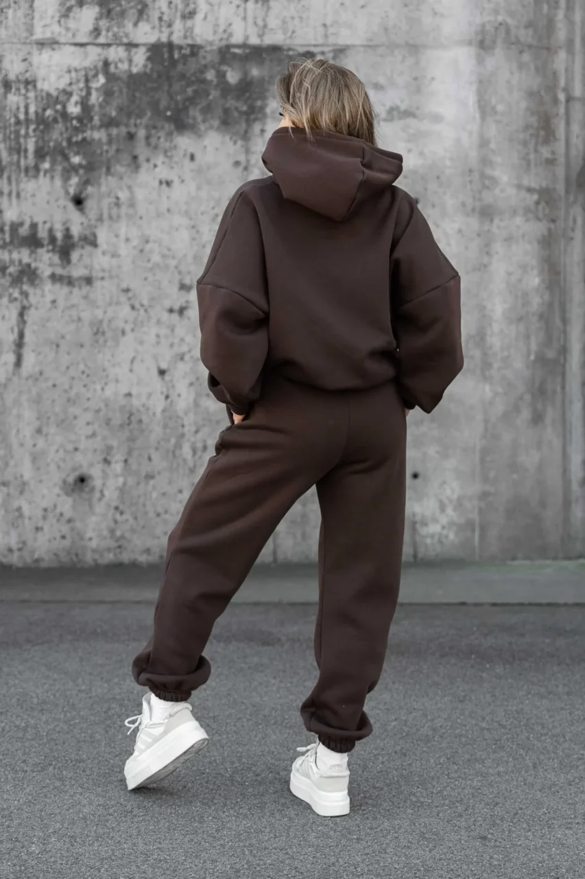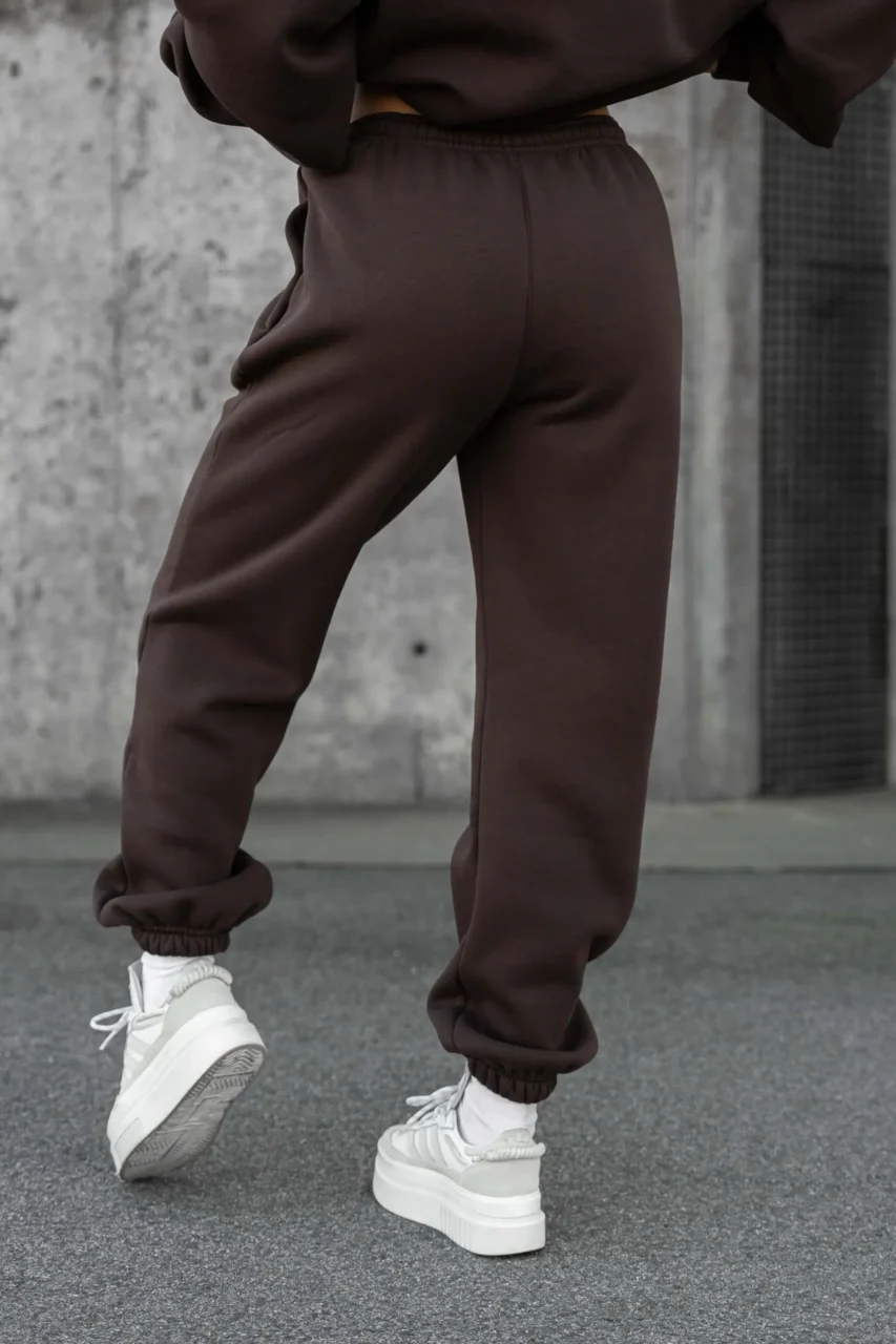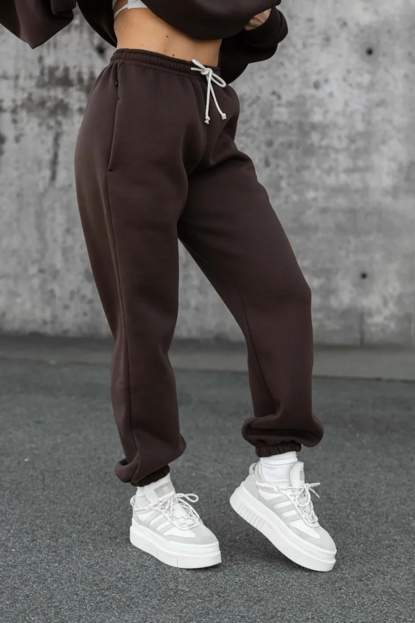 Czekoladowe spodnie dresowe świetnie sprawdzą się zarówno jako element kompletu, jak i noszone solo. Pasują do jasnych i ciemnych gór, tworząc modne stylizacje domowe, spacerowe i miejskie w stylu athleisure.