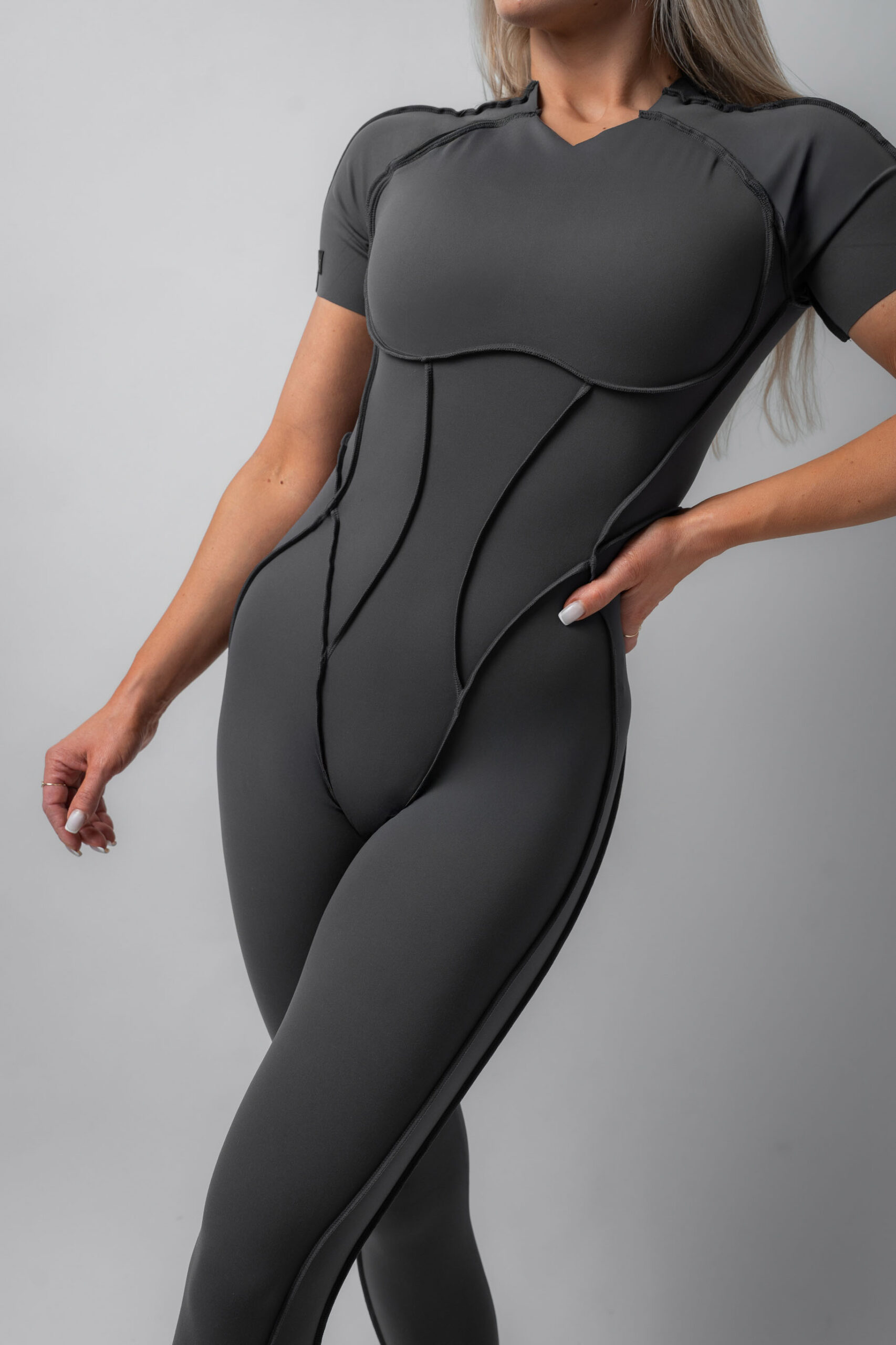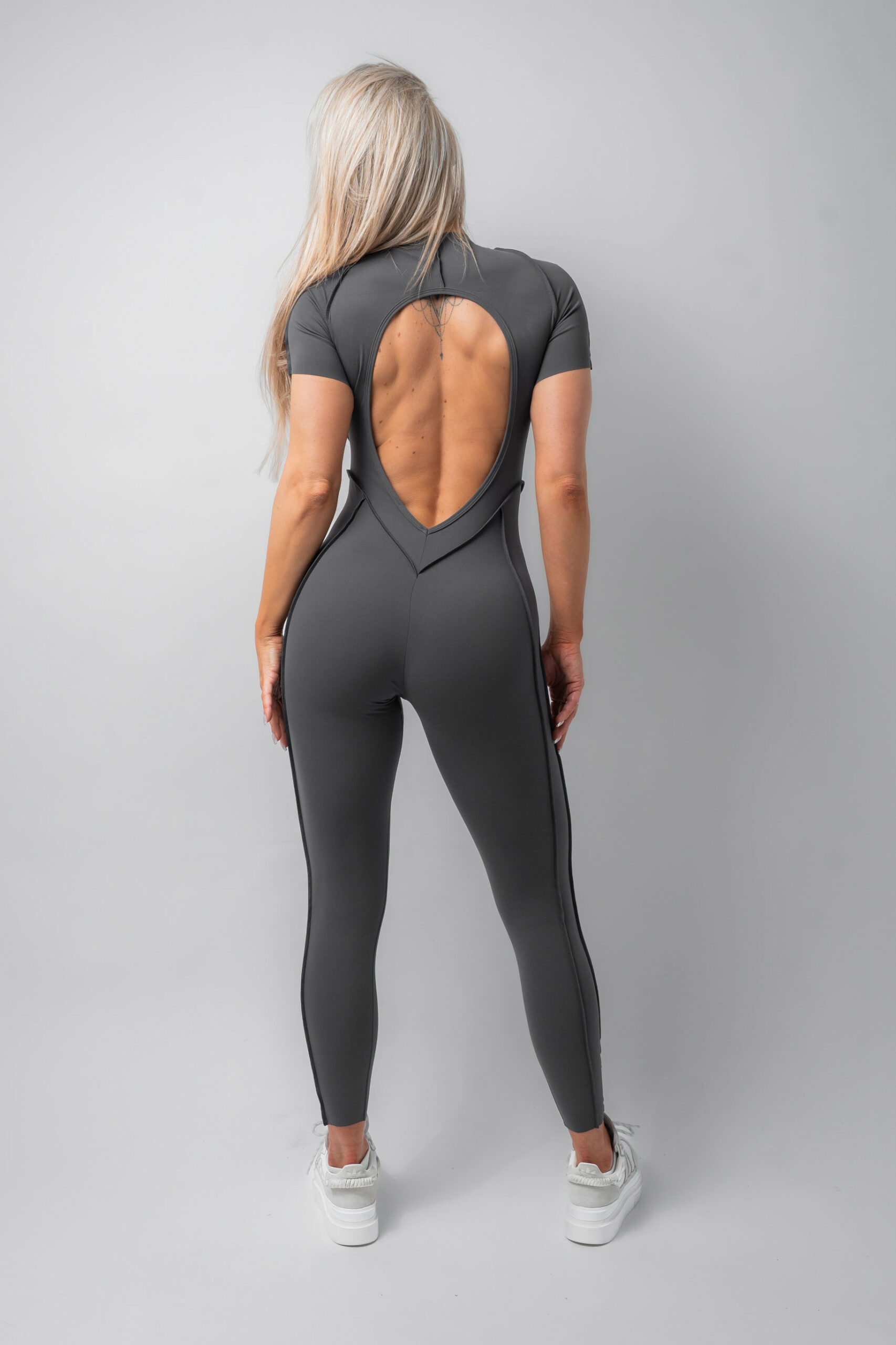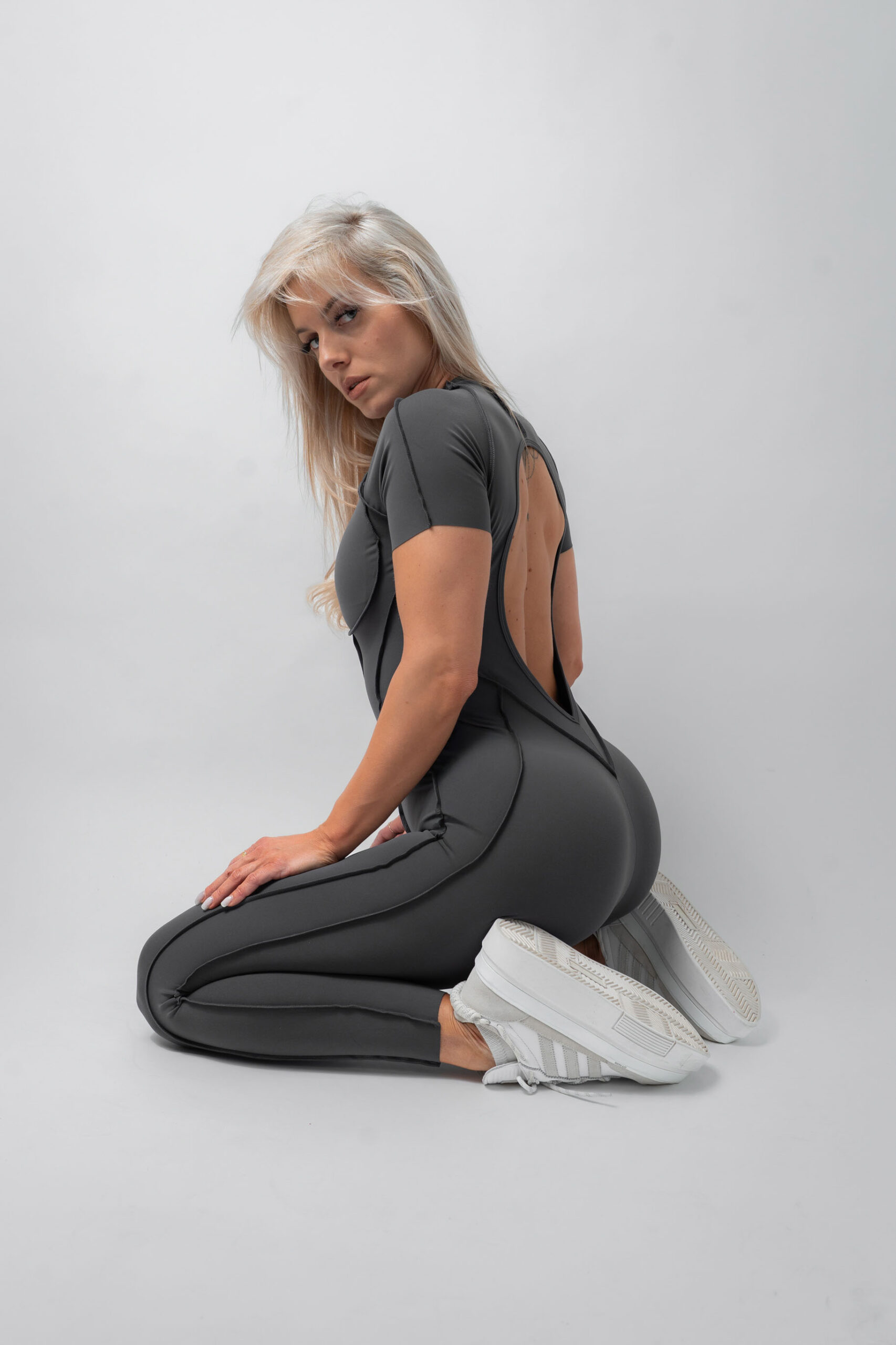 Kombinezon fitness szary Iconic to idealny wybór dla aktywnych kobiet, które pragną połączyć sportową wygodę z nowoczesnym designem. Ten damski kombinezon sportowy w kolorze szarym wyróżnia minimalistyczna elegancja oraz unikalne, stylowe przeszycia, które modelują sylwetkę i subtelnie wysmuklają talię oraz biodra. Bez pleców i z idealnie dopasowanym krojem, zapewnia maksymalną swobodę ruchów, jednocześnie podkreślając kobiece kształty.