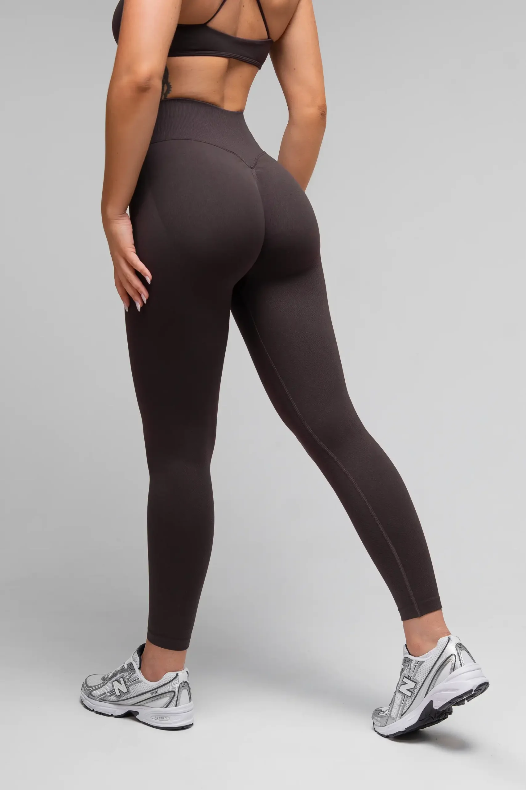 Legginsy bezszwowe Push-Up V-Cross ciemnobrązowe – modelująca sylwetka i modny odcień sezonu.
