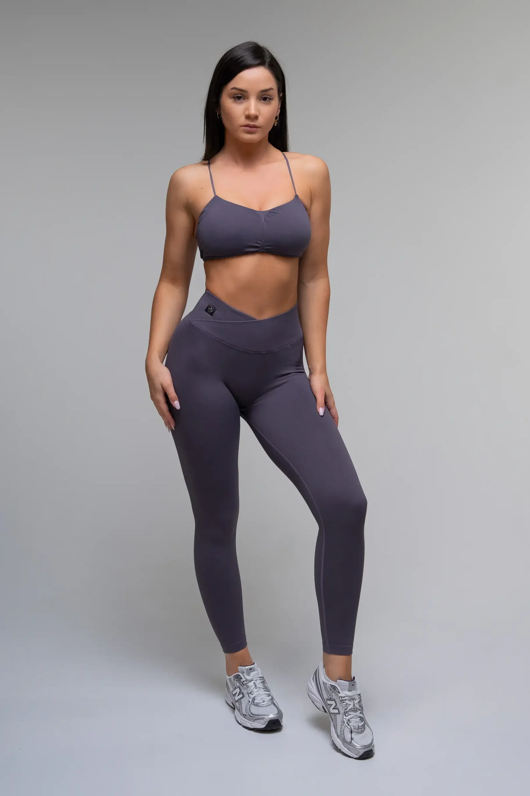 Top bezszwowy V Cross szary. Elegancki, stonowany odcień szarości sprawia, że top jest niezwykle uniwersalny i łatwy do dopasowania do każdej stylizacji treningowej.