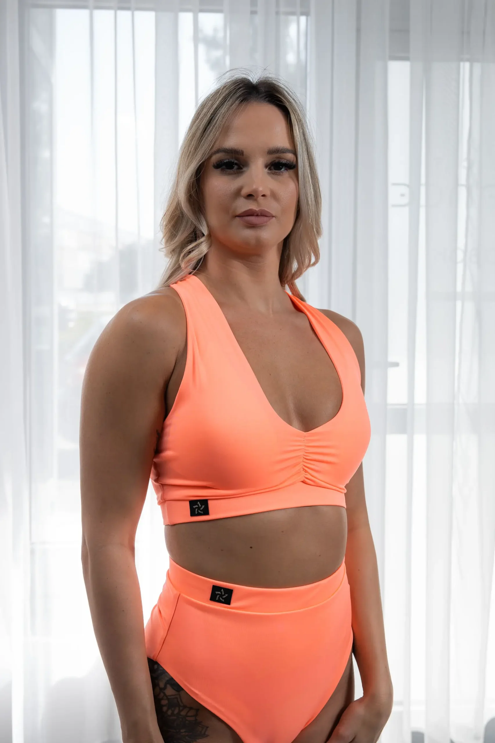 Top pole dance w pastelowej pomarańczy wyposażony jest w ramiączka z możliwością dowolnego wiązania – na jedno ramię lub na krzyż. To nie tylko element funkcjonalny, ale także modowy – zmieniaj układ, by dopasować go do swojej stylizacji i poziomu aktywności.