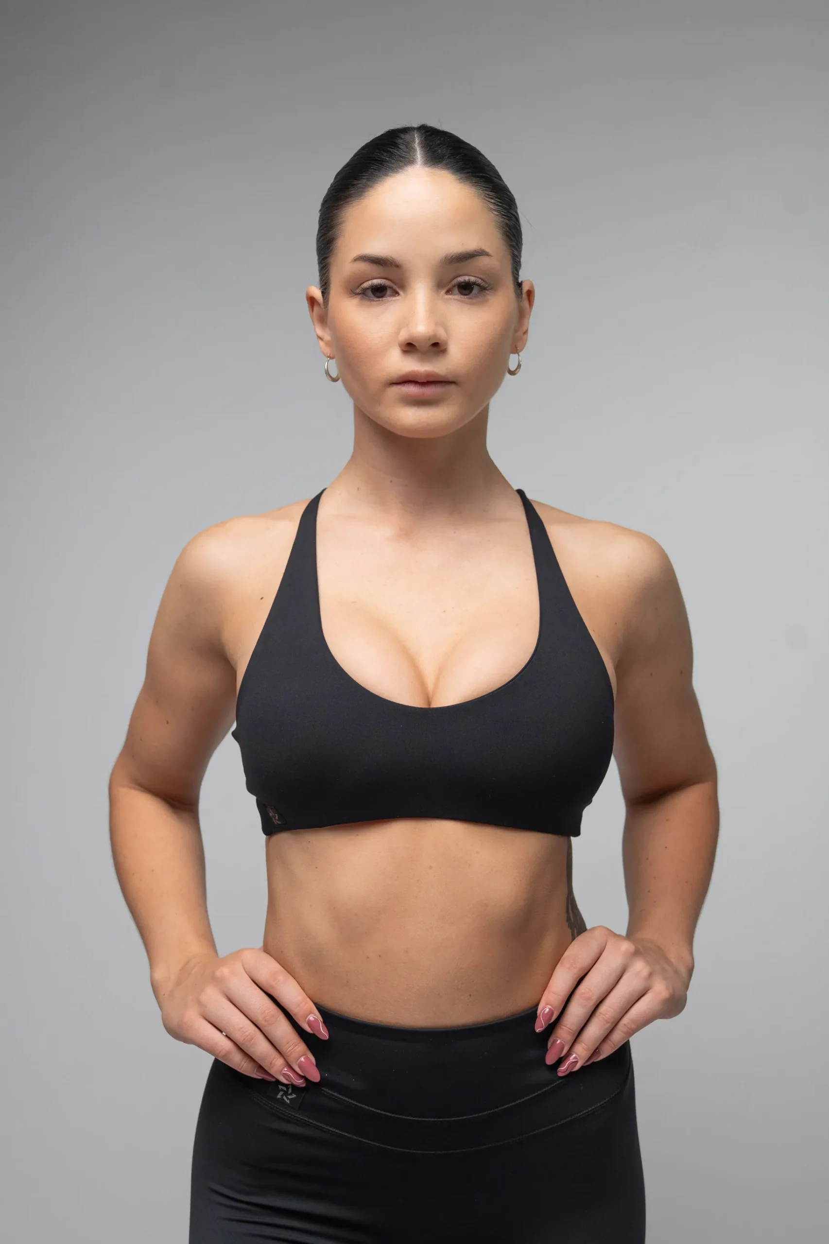 Czarny top sportowy z ramiączkami krzyżującymi się na plecach – klasyka, która pasuje do wszystkiego.