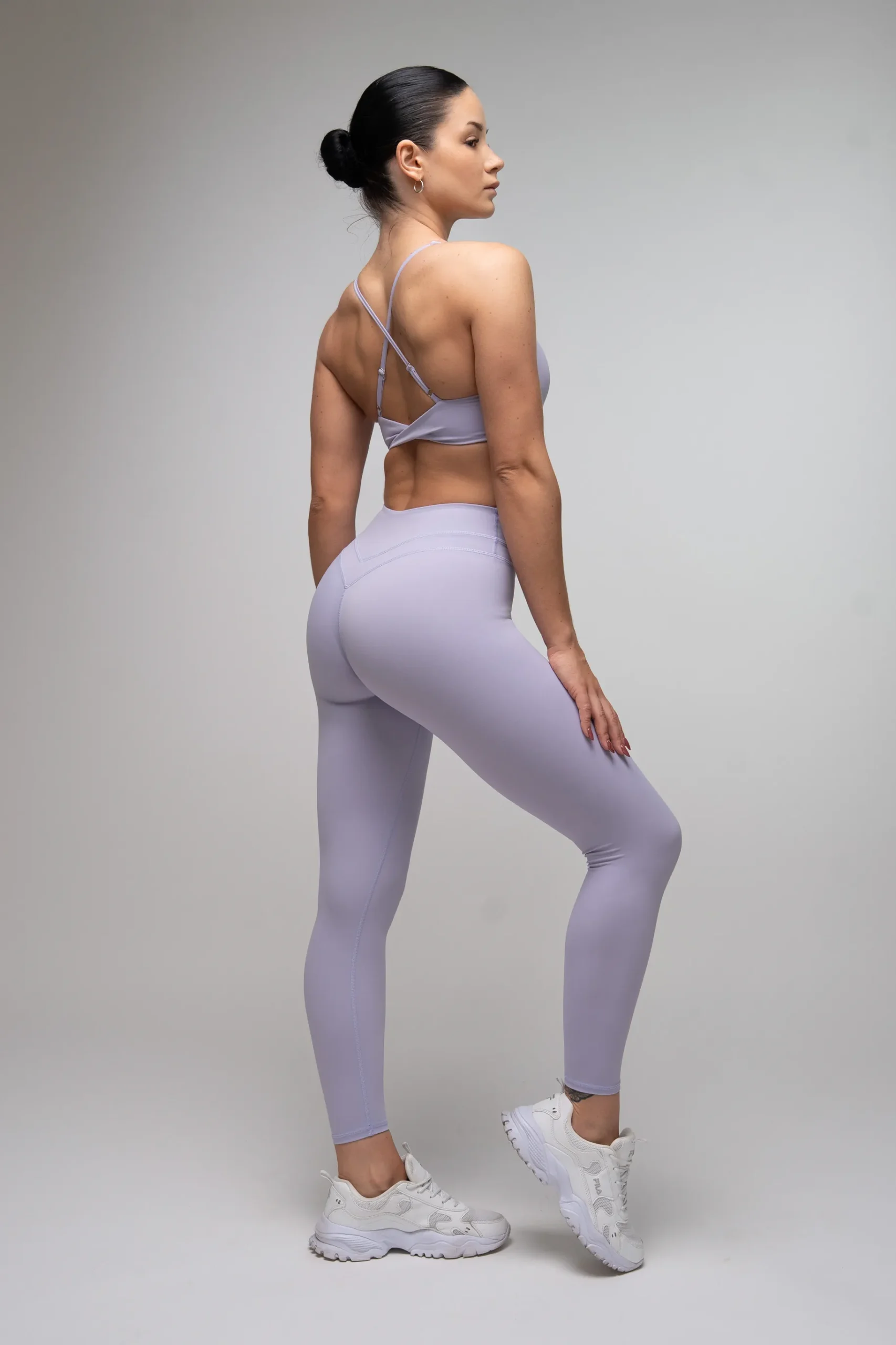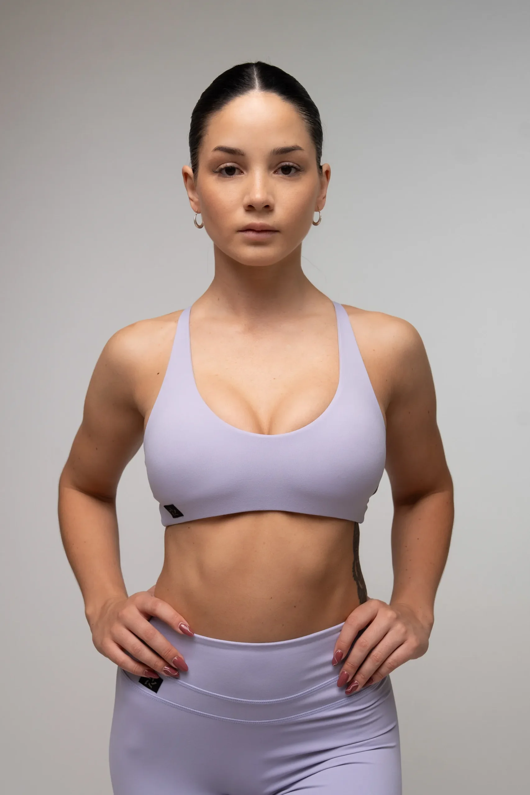 Pastelowy fioletowy top sportowy z krzyżującymi się ramiączkami – kobiecy i funkcjonalny.